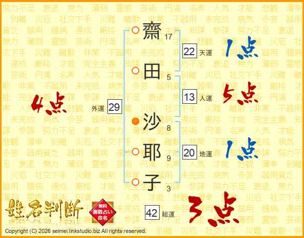 齋(17画)田(5画) 沙(8画)耶(9画)子(3画)
