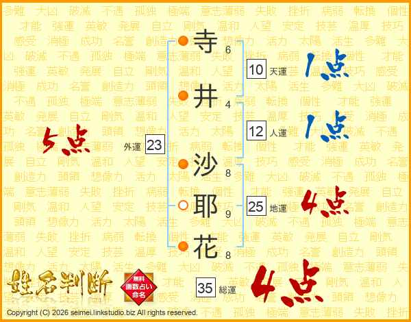 寺(6画)井(4画) 沙(8画)耶(9画)花(8画)