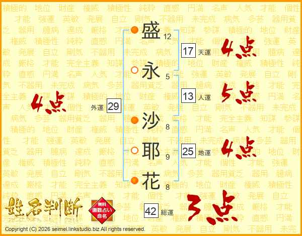 盛(12画)永(5画) 沙(8画)耶(9画)花(8画)