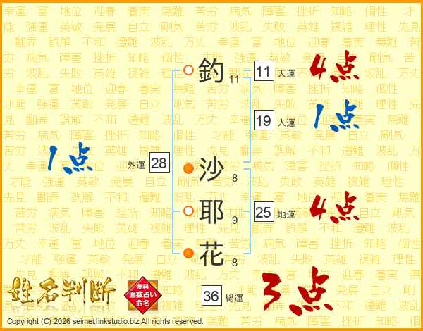 釣(11画) 沙(8画)耶(9画)花(8画)