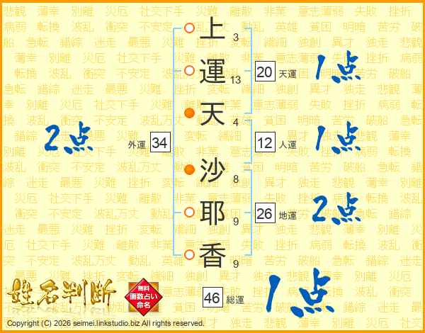 上(3画)運(13画)天(4画) 沙(8画)耶(9画)香(9画)