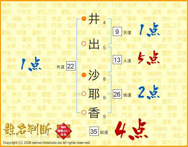 井(4画)出(5画) 沙(8画)耶(9画)香(9画)