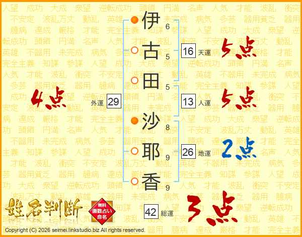 伊(6画)古(5画)田(5画) 沙(8画)耶(9画)香(9画)