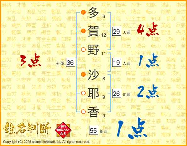 多(6画)賀(12画)野(11画) 沙(8画)耶(9画)香(9画)