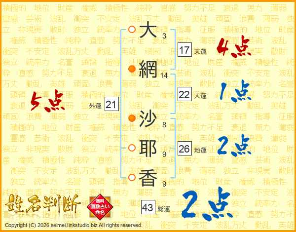 大(3画)網(14画) 沙(8画)耶(9画)香(9画)