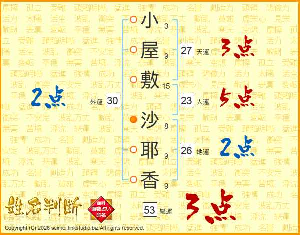 小(3画)屋(9画)敷(15画) 沙(8画)耶(9画)香(9画)