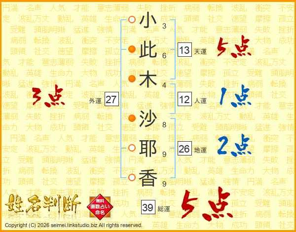 小(3画)此(6画)木(4画) 沙(8画)耶(9画)香(9画)