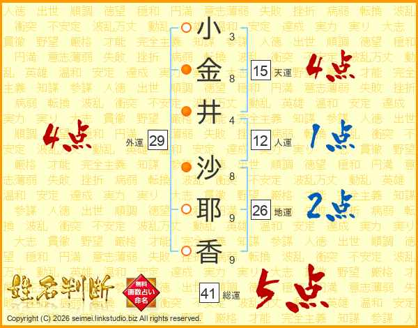 小(3画)金(8画)井(4画) 沙(8画)耶(9画)香(9画)