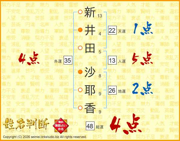 新(13画)井(4画)田(5画) 沙(8画)耶(9画)香(9画)