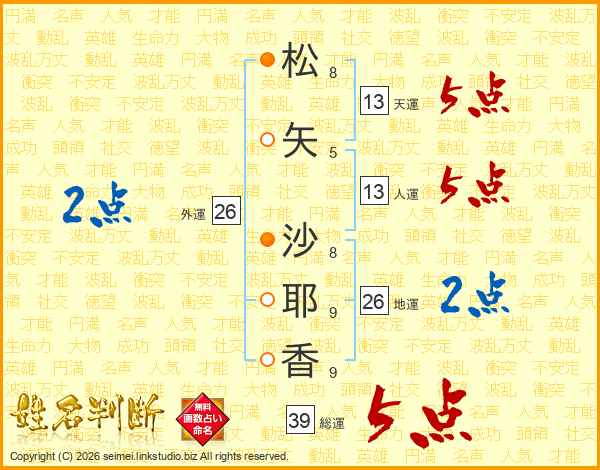 松(8画)矢(5画) 沙(8画)耶(9画)香(9画)