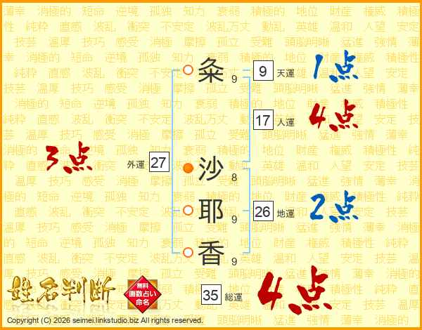 粂(9画) 沙(8画)耶(9画)香(9画)