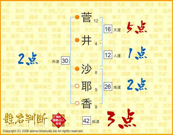菅(12画)井(4画) 沙(8画)耶(9画)香(9画)