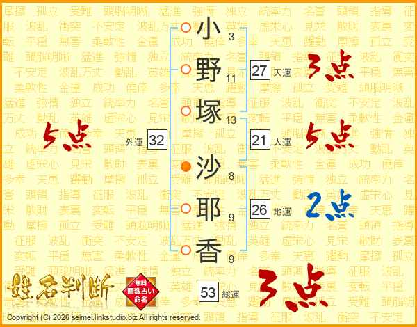 小野塚沙耶香さんの外運は32画の5点!