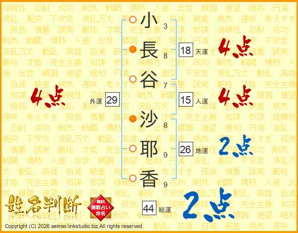小(3画)長(8画)谷(7画) 沙(8画)耶(9画)香(9画)