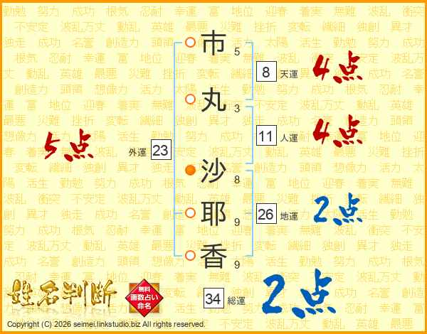 市(5画)丸(3画) 沙(8画)耶(9画)香(9画)
