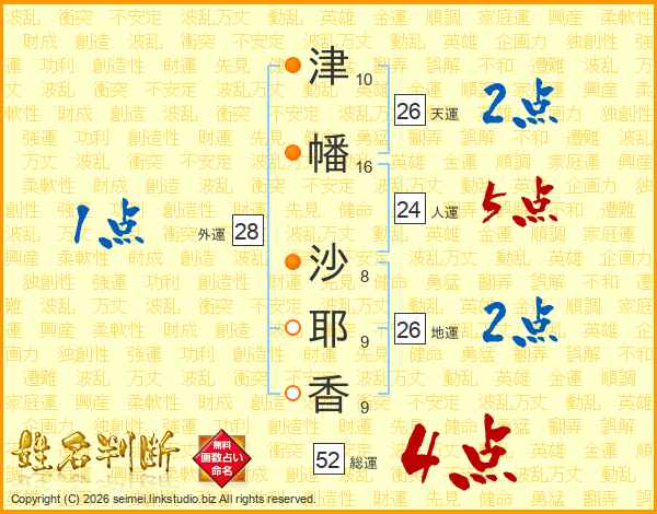 津(10画)幡(16画) 沙(8画)耶(9画)香(9画)