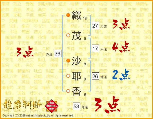 織(18画)茂(9画) 沙(8画)耶(9画)香(9画)