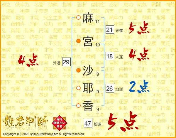 麻(11画)宮(10画) 沙(8画)耶(9画)香(9画)