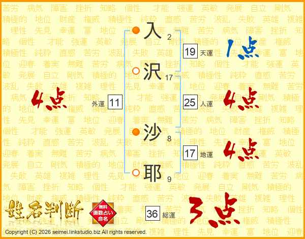 入(2画)沢(17画) 沙(8画)耶(9画)