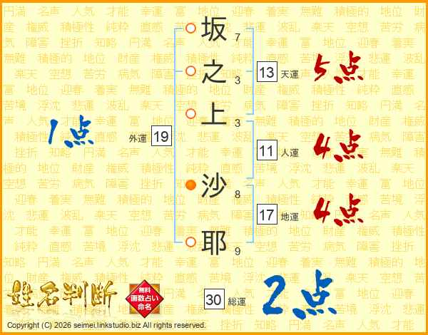 坂(7画)之(3画)上(3画) 沙(8画)耶(9画)