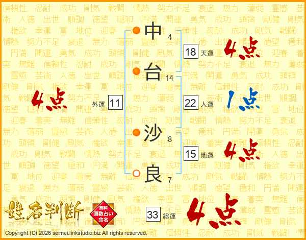 生活面を象徴する運勢です。外部から受ける影響力を表し、結婚運、家庭運や職場、環境への順応性を表します。総運から人運を引いた画数。姓や名が1文字の場合を除く。