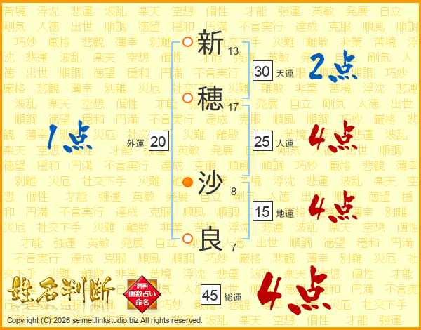 生活面を象徴する運勢です。外部から受ける影響力を表し、結婚運、家庭運や職場、環境への順応性を表します。総運から人運を引いた画数。姓や名が1文字の場合を除く。