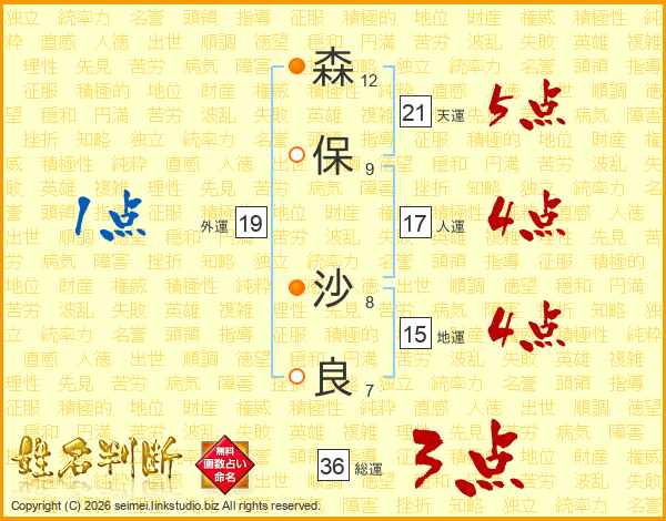 生活面を象徴する運勢です。外部から受ける影響力を表し、結婚運、家庭運や職場、環境への順応性を表します。総運から人運を引いた画数。姓や名が1文字の場合を除く。