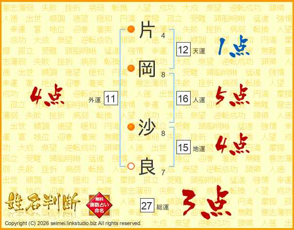 片(4画)岡(8画) 沙(8画)良(7画)