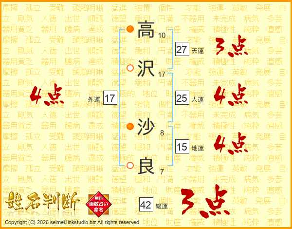 生活面を象徴する運勢です。外部から受ける影響力を表し、結婚運、家庭運や職場、環境への順応性を表します。総運から人運を引いた画数。姓や名が1文字の場合を除く。