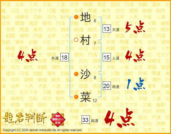 地村沙菜さんの総運は33画の4点!