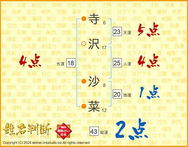 寺(6画)沢(17画) 沙(8画)菜(12画)