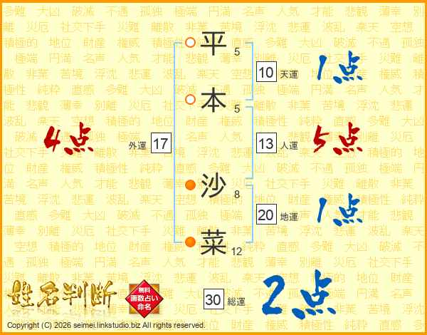 平本沙菜さんの総運は30画の2点!