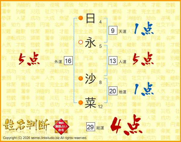 日(4画)永(5画) 沙(8画)菜(12画)