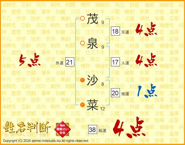 茂(9画)泉(9画) 沙(8画)菜(12画)