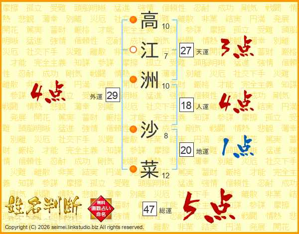 高(10画)江(7画)洲(10画) 沙(8画)菜(12画)