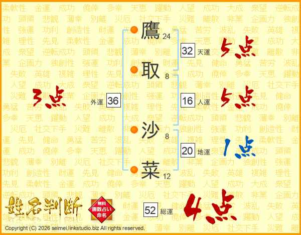鷹(24画)取(8画) 沙(8画)菜(12画)