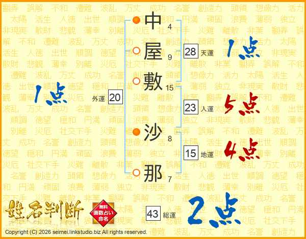 中(4画)屋(9画)敷(15画) 沙(8画)那(7画)