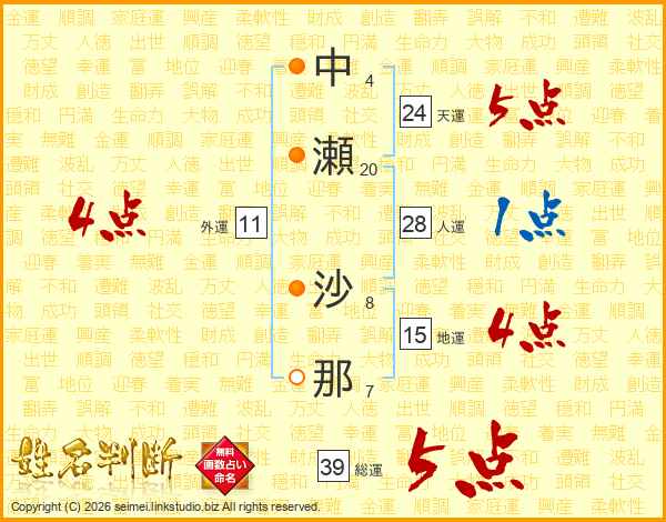 中(4画)瀬(20画) 沙(8画)那(7画)