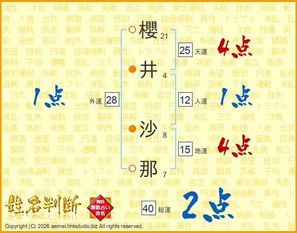 櫻(21画)井(4画) 沙(8画)那(7画)