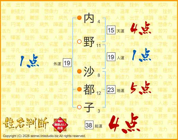 内(4画)野(11画) 沙(8画)都(12画)子(3画)