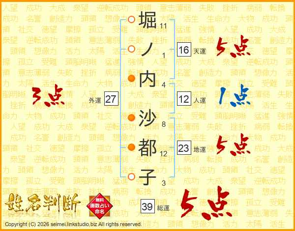 堀(11画)ノ(1画)内(4画) 沙(8画)都(12画)子(3画)