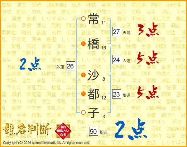 常(11画)橋(16画) 沙(8画)都(12画)子(3画)