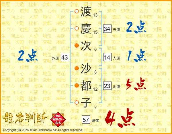 渡(13画)慶(15画)次(6画) 沙(8画)都(12画)子(3画)