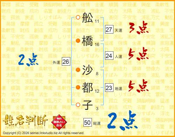 舩(11画)橋(16画) 沙(8画)都(12画)子(3画)