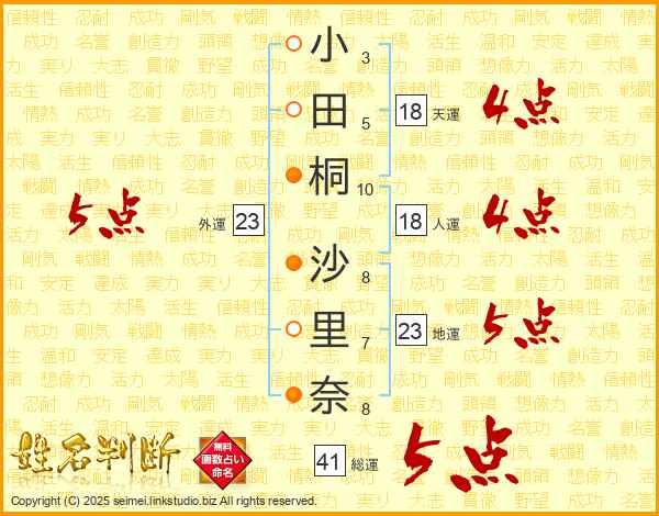 小(3画)田(5画)桐(10画) 沙(8画)里(7画)奈(8画)