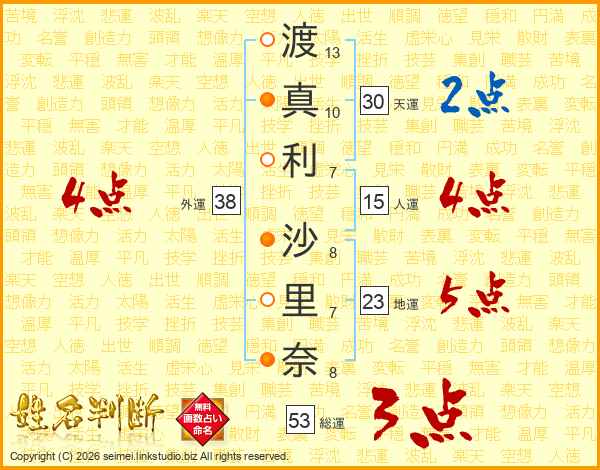渡(13画)真(10画)利(7画) 沙(8画)里(7画)奈(8画)