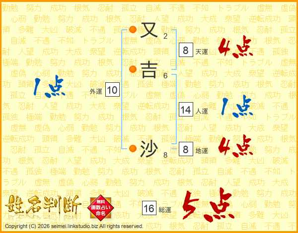 又吉沙さんの総運は16画の5点!
