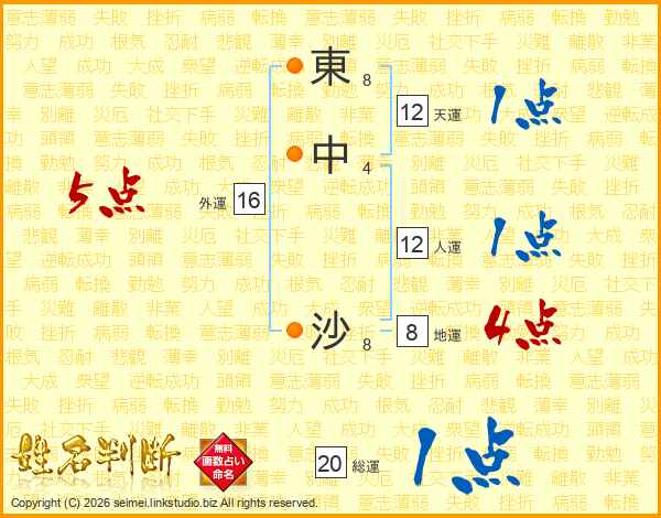 東(8画)中(4画) 沙(8画)
