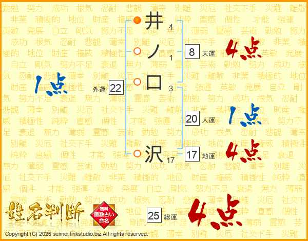 井(4画)ノ(1画)口(3画) 沢(17画)