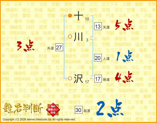 生活面を象徴する運勢です。外部から受ける影響力を表し、結婚運、家庭運や職場、環境への順応性を表します。総運から人運を引いた画数。姓や名が1文字の場合を除く。